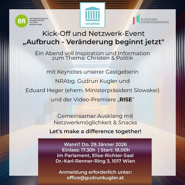Herzliche Einladung zum Kick-Off und Netzwerk-Event "Aufbruch - Veränderung beginnt jetzt" zur Rolle von Christen im öffentlichen Leben am Donnerstag, 29. Jänner, um 18.00 Uhr im Parlament: Hochkarätige Gäste aus Politik, Wirtschaft, Kirche und Zivilgesellschaft, eine ermutigende Keynote (u. a. mit Eduard Heger), die Premiere des Videos „RISE – Jede Stimme zählt“ sowie Austausch und Vernetzung bei Buffet. Anmeldung erforderlich: office@gudrunkugler.at (first come, first serve). ![]() Frohe Weihnachten! Zum Weihnachtsfest und zum Jahreswechsel wünsche ich Ihnen gemeinsam mit meinem Team von Herzen gesegnete und friedvolle Tage sowie Gottes Segen für das Jahr 2026! Ihre und Eure ![]() ![]() |