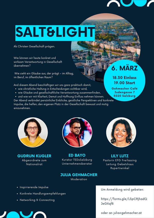 Liebe Unterstützer, lieber Freunde,ich freue mich sehr, euch am Freitag, 6. März, in Salzburg zu besuchen. An diesem Tag darf ich gleich bei zwei Veranstaltungen zu Gast sein, zu denen ich euch herzlich einladen möchte. Um 17:00 Uhr findet im Bischofshaus Foyer am Kapitelplatz ein Kamingespräch unter dem Titel Europa ohne Kinder – Der demografische Winter und seine Folgen statt. Dabei geht es um die gesellschaftlichen Auswirkungen von niedrigen Geburtenraten und Überalterung in Europa sowie um die politischen Herausforderungen, die sich daraus ergeben. Anmeldung per E-Mail an bischofsvikariat.ehe-familie@eds.at. Weitere Informationen: Kamingespräch mit Gudrun Kugler - Referat für Ehe und Familie ![]() Am Abend um 19:00 Uhr folgt im Gehmacher Café die Veranstaltung SALT & LIGHT – Als Christen Gesellschaft prägen. Gemeinsam mit Ed Bayo und Lily Lutz sprechen wir darüber, wie christlicher Glaube heute Verantwortung in Gesellschaft, Beruf und öffentlichem Raum übernehmen kann. Einlass ist ab 18:30 Uhr, Anmeldung unter https://forms.gle/nikhwk97Sssn5F4Y7. ![]() Aus aktuellem Anlass darf ich euch auf meinen Podcast zum soeben erschienenen Rechtsextremismusbericht mit Jan Ledochowski hinweisen, welcher haarsträubende anti-christliche Tendenzen aufweist (https://youtu.be/AjiRCEDH2HM). Zur geopolitischen Situation, Grönland und der Rolle Österreichs sprach ich gemeinsam mit einem Abgeordnetenkollegen von den NEOS mit der Geopolitik-Expertin Velina Tchakarova – da ist einiges Interessantes, worüber man gerade so diskutiert, dabei: https://youtu.be/dDQsYdky9NI Ich freue mich sehr auf persönliche Begegnungen und gute Gespräche in Salzburg! Ihre und eure ![]() |