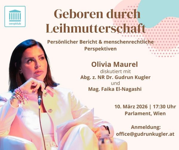 Liebe Unterstützer, liebe Freunde,Heute darf ich zu einigen Veranstaltungen einladen sowie auf neue Podcasts und YouTube-Videos hinweisen: ![]() „Geboren durch Leihmutterschaft – Persönlicher Bericht und menschenrechtliche Perspektiven“ Anlässlich des Internationalen Frauentags lade ich zu einer Veranstaltung mit der internationalen Aktivistin und Autorin Olivia Maurel ins Parlament ein. Olivia Maurel wurde selbst durch Leihmutterschaft geboren. Heute setzt sie sich international mit den ethischen, psychologischen und menschenrechtlichen Fragen rund um die wachsende Leihmutterschaftsindustrie auseinander. Im Rahmen der Veranstaltung stellt sie die deutsche Ausgabe ihres Buches „Wo bist du, Mama?“ vor und spricht über ihre persönliche Geschichte sowie über die gesellschaftlichen Auswirkungen von Leihmutterschaft auf Kinder, Frauen und Familie. Nach einer Keynote von Olivia Maurel findet ein moderiertes Gespräch mit Publikumsdiskussion statt. Wir freuen uns, dass Athena-Direktorin NR-Abg. a.D. Faika El-Nagashi mit dabei ist. Datum: 10. März l Uhrzeit: 17:30 Uhr Ort: Palais Epstein, Wien Sprache: Englisch (teilweise Zusammenfassung auf Deutsch) Wir freuen uns über Ihre Teilnahme und bitten um Anmeldung unter: office(at)gudrunkugler.at ![]() „Gehört werden: Frauen aus religiösen Minderheiten“ Anlässlich des Internationalen Frauentags lade ich gemeinsam mit Missio herzlich in das österreichische Parlament ein. Die Päpstlichen Missionswerke erleben täglich, welch großen Schwierigkeiten Frauen weltweit ausgesetzt sind, besonders wenn sie zu religiösen Minderheiten gehören. Frauen aus religiösen Minderheiten stehen oft unter doppeltem Druck – weil sie Frauen sind, und weil sie Minderheiten angehören. Doch gerade solche Frauen sind starke Trägerinnen von Resilienz und Hoffnung. Am Donnerstag, 5. März 2026, von 18:00 bis 20:00 Uhr im Parlament, Lokal 3 – Theophil Hansen. Das Programm umfasst persönliche Zeugnisse, wissenschaftliche Erkenntnisse und politische Perspektiven: Keynote der Ordensfrau Schwester Annie Demerjian (Beirut / Damaskus) über die Lebensrealitäten christlicher Frauen im Libanon und in Syrien; moderiertes Panel mit Frauen aus religiösen Minderheiten, Wissenschaftlerinnen und Vertreterinnen kirchlicher Organisationen, anschließend informeller Austausch bei Wein und Brötchen Anmeldung bitte an office(at)gudrunkugler.at. ![]() Bei unserer großen Veranstaltung „Aufbruch – Veränderung beginnt jetzt“ gemeinsam mit der Evangelischen Allianz Wien und der Plattform Christdemokratie durfte ich vor rund 270 Gästen und 19 Ausstellern unterschiedlicher christlicher Werke eine Rede halten: Leben Christen anders? Dazu gibt es spannende Studien! Wie haben Christen in der Geschichte dazu beigetragen, dass Recht und Gesellschaft harmonisiert werden? Ich habe über zwanzig Punkte gefunden! Und ist der Gestaltungsauftrag beendet? Natürlich nicht! Also was tun? Das könnt Ihr hier auf Youtube in einer 20-min-Rede nachsehen. ![]() Unsere Unternehmen sind unter Druck. Hohe Steuern, Überregulierung, Fachkräftemangel stellen den Standort in Frage. Die Regierung hat sich auf ein Entbürokratisierungspaket und eine Industriestrategie geeinigt. Was heißt das genau? Und wird das genügen? Die Nationalratsabgeordneten Gudrun Kugler (ÖVP) und Veit Dengler (NEOS) dazu im 15 min Podcast „Zwischen den Stühlen“: https://youtu.be/ouGtR8Gi1eM ![]() Wir haben 10 Kinder! Nicht miteinander - aber in Summe. Und wir sind total begeistert und glücklich! Elternschaft als „letztes wahres Abenteuer“, das „verletzlicher, weicher, menschlicher“ macht und „das Sinnvakuum füllt“ in einem ganz persönlichen Gespräch zwischen den Abgeordneten Veit Dengler (NEOS) und Gudrun Kugler (ÖVP), 17 min, Link: https://youtu.be/INjBsgyFyi8?si=pUrjZxQFz2pc8zCv Es gibt Jobs in unserem Umfeld: 10h-Mitarbeiter für Social Media; Sommerjob zum Thema Religionsfreiheit; sowie ein Vollzeitjob im Büromanagement. Bei Interesse bitte per Email melden – wir leiten das dann weiter. Wir bereiten derzeit für Mai intensiv das große parlamentarische Gebetsfrühstück mit hochrangigen Gästen aus dem In- und Ausland vor und bitten um Eure Unterstützung im Gebet! Danke für Eure Freundschaft, ![]() |