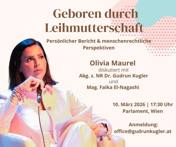 Liebe Unterstützer, lieber Freunde,ich freue mich sehr, euch zu mehreren spannenden Veranstaltungen in den kommenden Wochen einladen zu dürfen: ![]() „Gehört werden: Frauen aus religiösen Minderheiten“ Anlässlich des Internationalen Frauentags lade ich gemeinsam mit Missio herzlich in das österreichische Parlament ein. Die Päpstlichen Missionswerke erleben täglich, welch großen Schwierigkeiten Frauen weltweit ausgesetzt sind, besonders wenn sie zu religiösen Minderheiten gehören. Frauen aus religiösen Minderheiten stehen oft unter doppeltem Druck – weil sie Frauen sind, und weil sie Minderheiten angehören. Doch gerade solche Frauen sind starke Trägerinnen von Resilienz und Hoffnung. Am Donnerstag, 5. März 2026, von 18:00 bis 20:00 Uhr im Parlament, Lokal 3 – Theophil Hansen. Das Programm umfasst persönliche Zeugnisse, wissenschaftliche Erkenntnisse und politische Perspektiven: Keynote der Ordensfrau Schwester Annie Demerjian (Beirut / Damaskus) über die Lebensrealitäten christlicher Frauen im Libanon und in Syrien; moderiertes Panel mit Frauen aus religiösen Minderheiten, Wissenschaftlerinnen und Vertreterinnen kirchlicher Organisationen, anschließend informeller Austausch bei Wein und Brötchen Anmeldung bitte an office(at)gudrunkugler.at. ![]() „Geboren durch Leihmutterschaft – Persönlicher Bericht und menschenrechtliche Perspektiven“ Anlässlich des Internationalen Frauentags lade ich außerdem zu einer Veranstaltung mit der internationalen Aktivistin und Autorin Olivia Maurel ins Parlament ein. Olivia Maurel wurde selbst durch Leihmutterschaft geboren. Heute setzt sie sich international mit den ethischen, psychologischen und menschenrechtlichen Fragen rund um die wachsende Leihmutterschaftsindustrie auseinander. Im Rahmen der Veranstaltung stellt sie die deutsche Ausgabe ihres Buches „Wo bist du, Mama?“ vor und spricht über ihre persönliche Geschichte sowie über die gesellschaftlichen Auswirkungen von Leihmutterschaft auf Kinder, Frauen und Familie. Nach einer Keynote von Olivia Maurel findet ein moderiertes Gespräch mit Publikumsdiskussion statt. Wir freuen uns, dass Athena-Direktorin NR-Abg. a.D. Faika El-Nagashi mit dabei ist. Datum: 10. März l Uhrzeit: 17:30 Uhr Ort: Palais Epstein, Wien Sprache: Englisch (teilweise Zusammenfassung auf Deutsch) Wir freuen uns über Ihre Teilnahme und bitten um Anmeldung unter: office(at)gudrunkugler.at ![]() Sehr gerne bin ich im Advisory Board von Mary’s Meals. Heute möchte ich auf das bevorstehende Gala-Benefizkonzert zugunsten dieser beeindruckenden Initiative aufmerksam zu machen: Mit den Erlösen wird eine Schulküche in Malawi finanziert. Es erwartet uns ein hochkarätiger Konzertabend. Ich lade euch herzlich ein, dabei zu sein, und freue mich über eure Anmeldung unter konzert(at)marysmeals.at. Ich freue mich sehr auf persönliche Begegnungen und gute Gespräche! Ihre und eure ![]() |